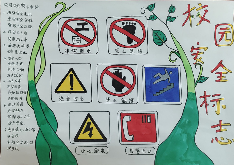 校园是员工一天中生活时间最长的地方,而安全是我们生活和学习的前提和保障,我们要时刻做到将安全“放在心中、记在心中、刻在心中”。参赛作品围绕“维护你我安全,共创和谐校园”这一主题展开设计,各班同学认真设计了“当心台阶”、“小心触电”、“减速慢行”等一系列安全警示标志,希望通过作品中的安全警示标志帮助员工们树立防患于未然的理念,提高安全意识。“安全责任重于泰山”,只有懂得安全知识,注重安全,积极地加以防范,才能够及时发现和消除安全隐患。