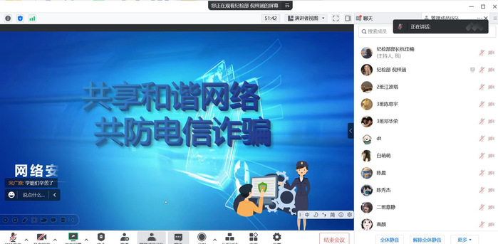 “共享和谐网络,共防电信诈骗”主题班会,20级、21级以线下的形式开展,22级新生以线上的形式开展。宣讲人通过视频、相声、动画的方式从身边的真实案例入手,围绕电信诈骗的形式、如何分辨电信诈骗、如何防范电信诈骗等方面进行宣讲,提醒大家在日常生活中要时刻保持警惕,遇到问题及时向老师或者家长反映,不要被一时的“诱惑”冲昏了头脑,不贪心,不盲目,做财产安全、网络安全的守卫者。