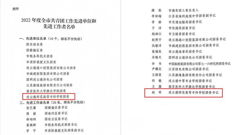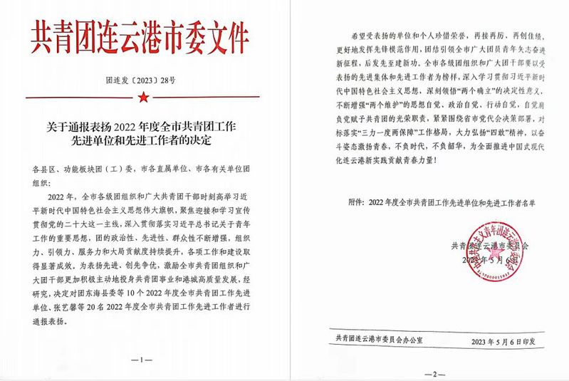 为表扬先进、创先争优,激励全市共青团组织和广大团干部更加积极主动地投身共青团事业和港城高质量发展,5月6日,共青团连云港市委员会发布了《2022年度全市共青团工作先进单位和先进工作者的决定》(团连发﹝2023﹞28号)文件。公司荣获“2022年度全市共青团工作先进单位”,校团委书记兼机关党总支书记(组织部副部长、统战部副部长)赵昕荣获“2022年度全市共青团先进工作者”。